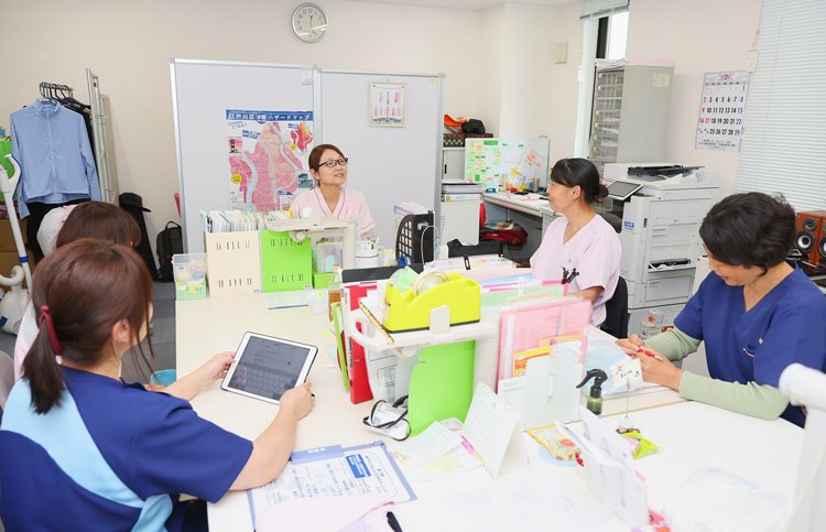 当ステーションは、病気や障害を持ちながらでも「在宅生活を続けたい」という思いを少しでも支えたいという気持ちで、看護師・ケアマネ・事務がチーム一丸となって在宅ケアを行っています。